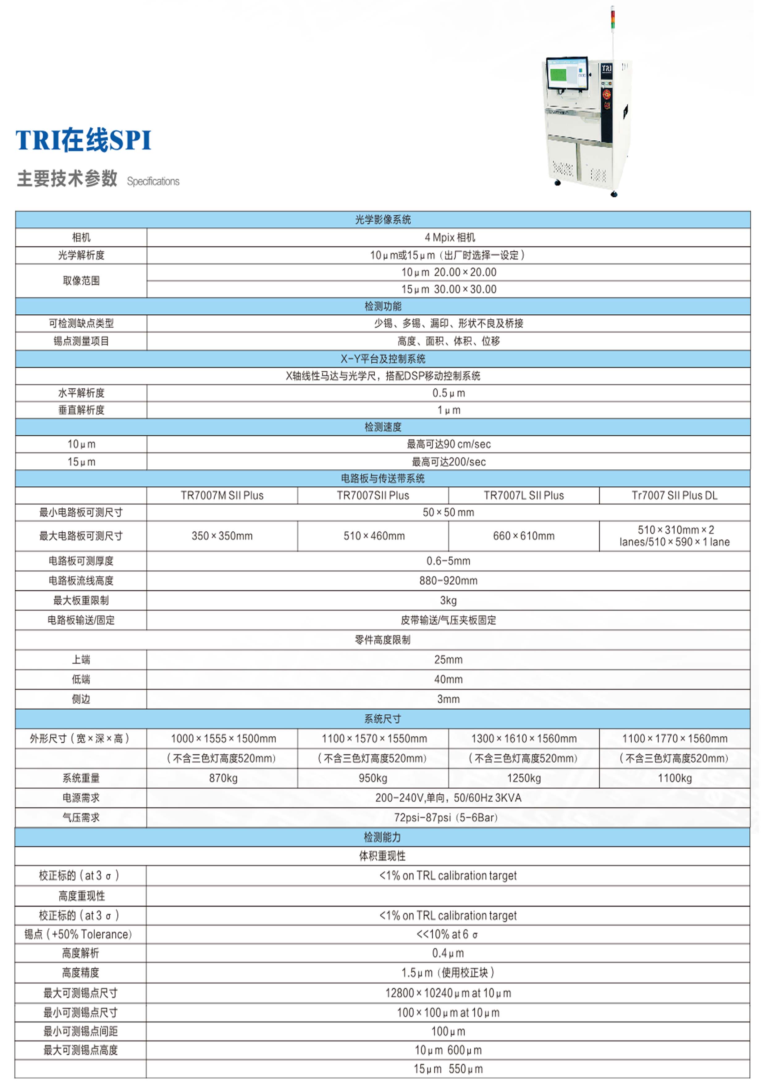 TR7007 SII Plus是产业最快速的锡膏印刷检测机,检测速度高达200 cm2/sec。高精度在线型无阴影的锡膏印刷检测蘑菇短视频免费提供全3D检测,分辨率包含15 μm or 10 μm并具备高精度线型马达平台。此系统的特点包括closed loop function、强化的2D成像技术、自动板弯补偿功能与条纹光扫描技术。TRI快速且直觉化的操作介面提供简易编程、容易操作的优点,为您的生产线带来最大的价值。